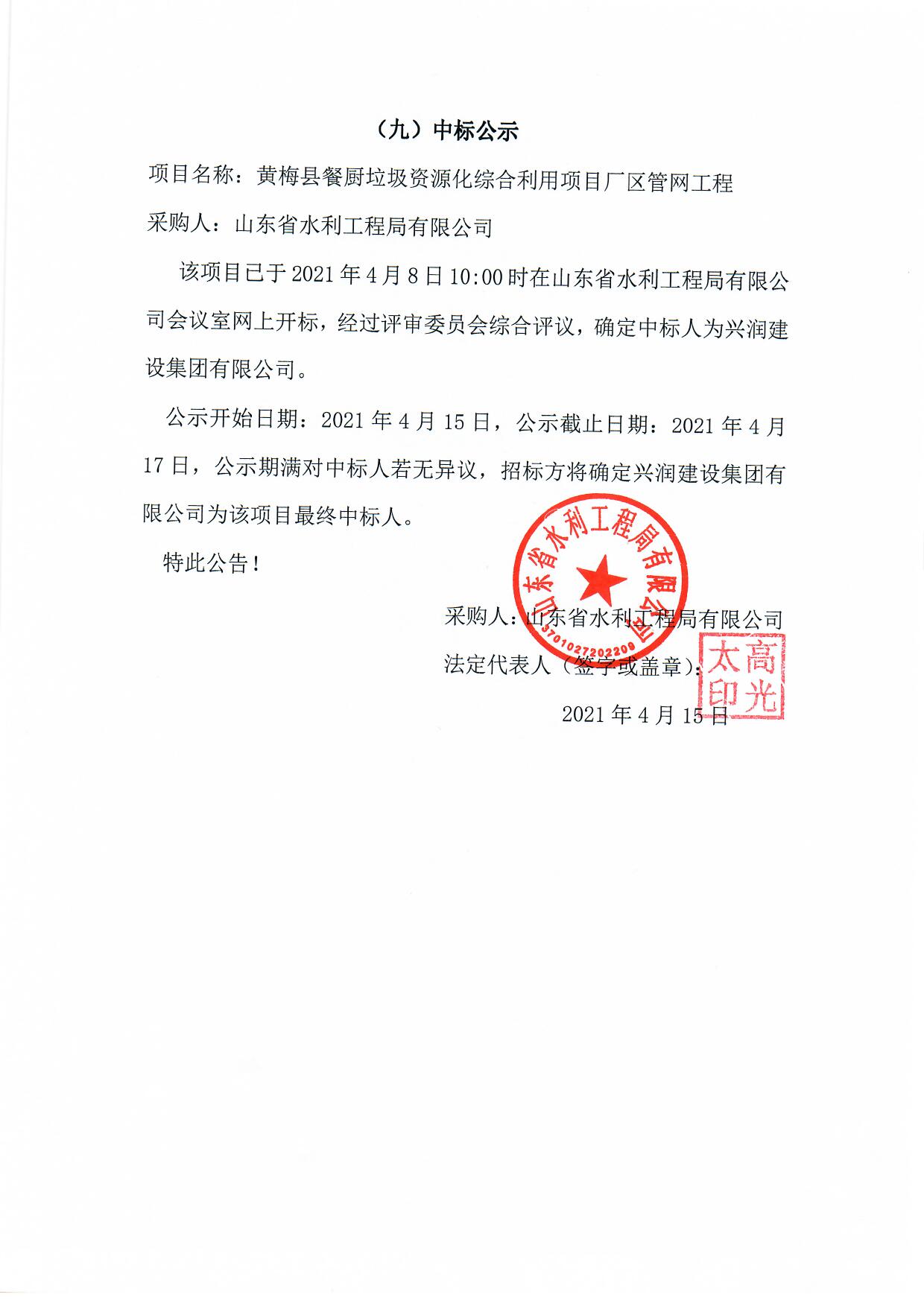 黃梅縣餐廚垃圾資源化綜合利用項(xiàng)目廠區(qū)管網(wǎng)工程中標(biāo)公示