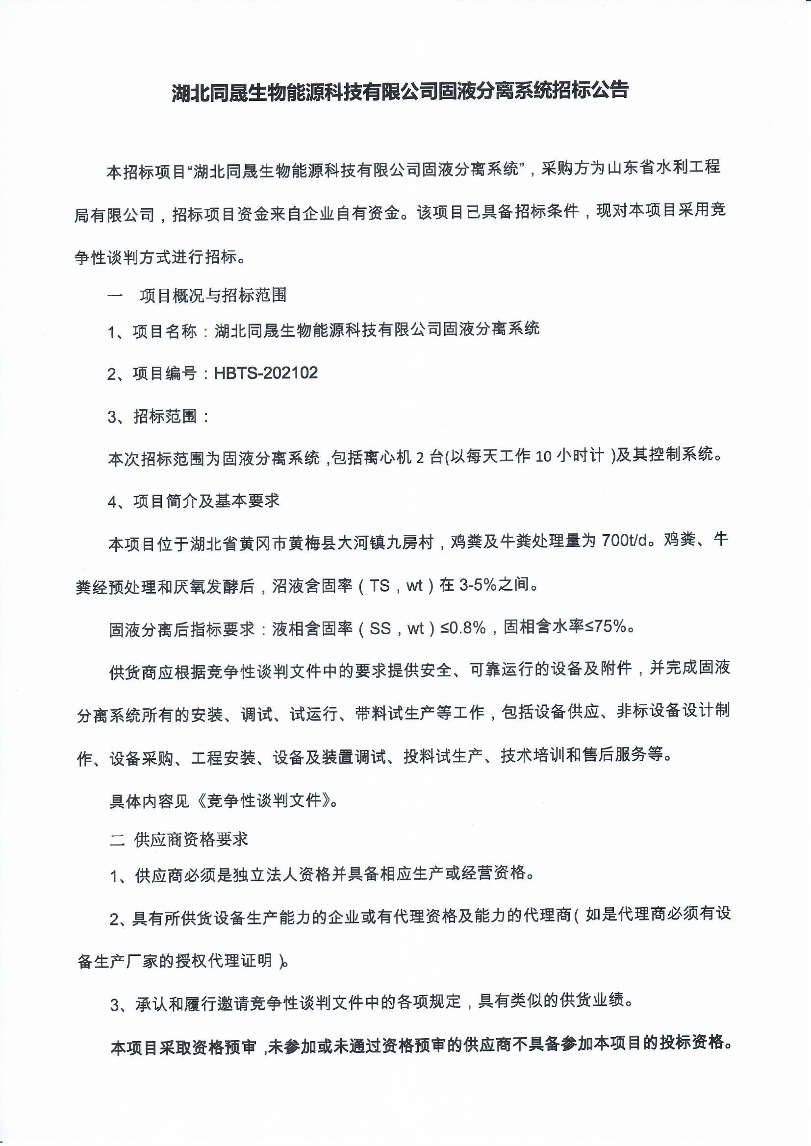 湖北同晟生物能源科技有限公司固液分離系統(tǒng)招標公告