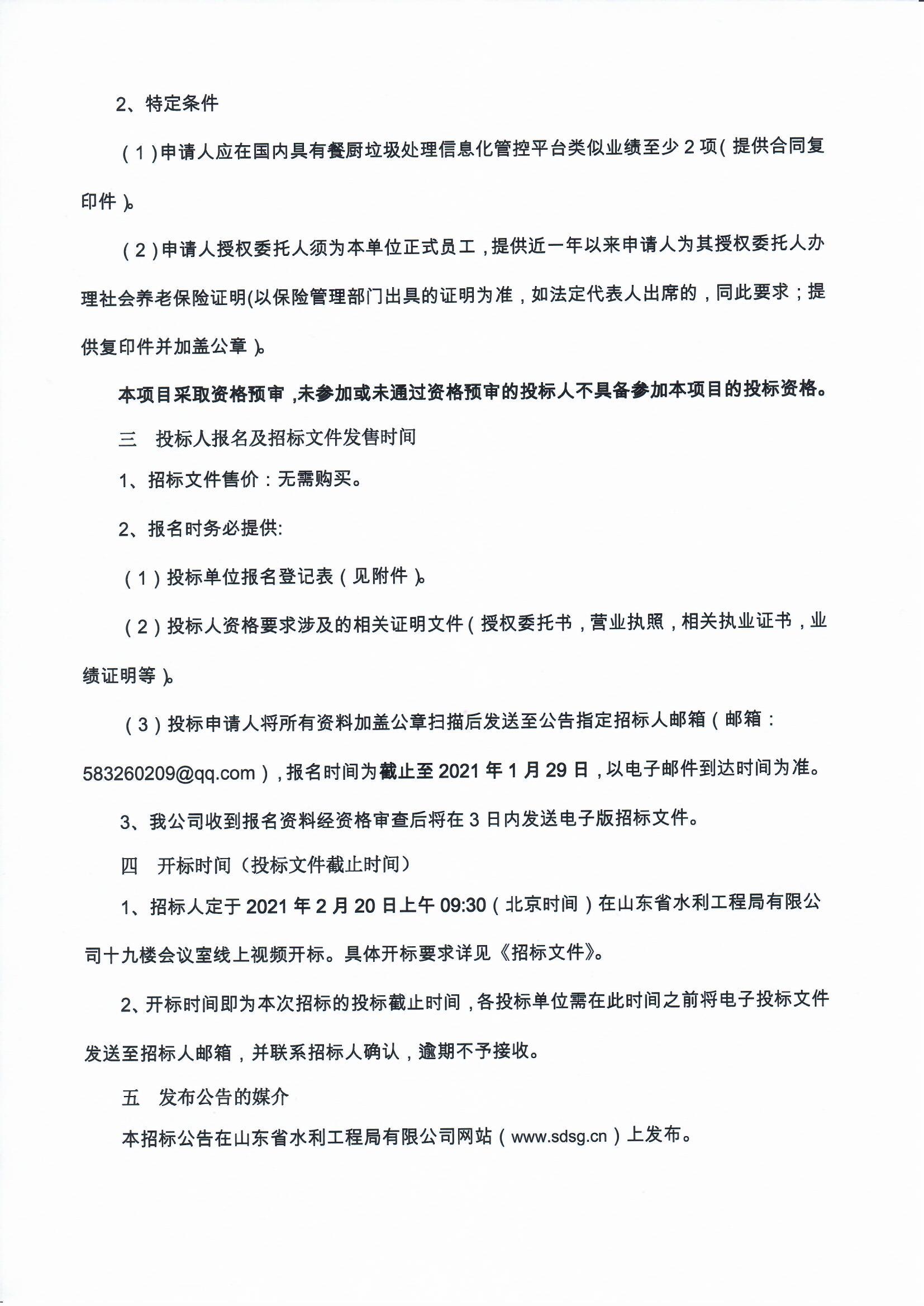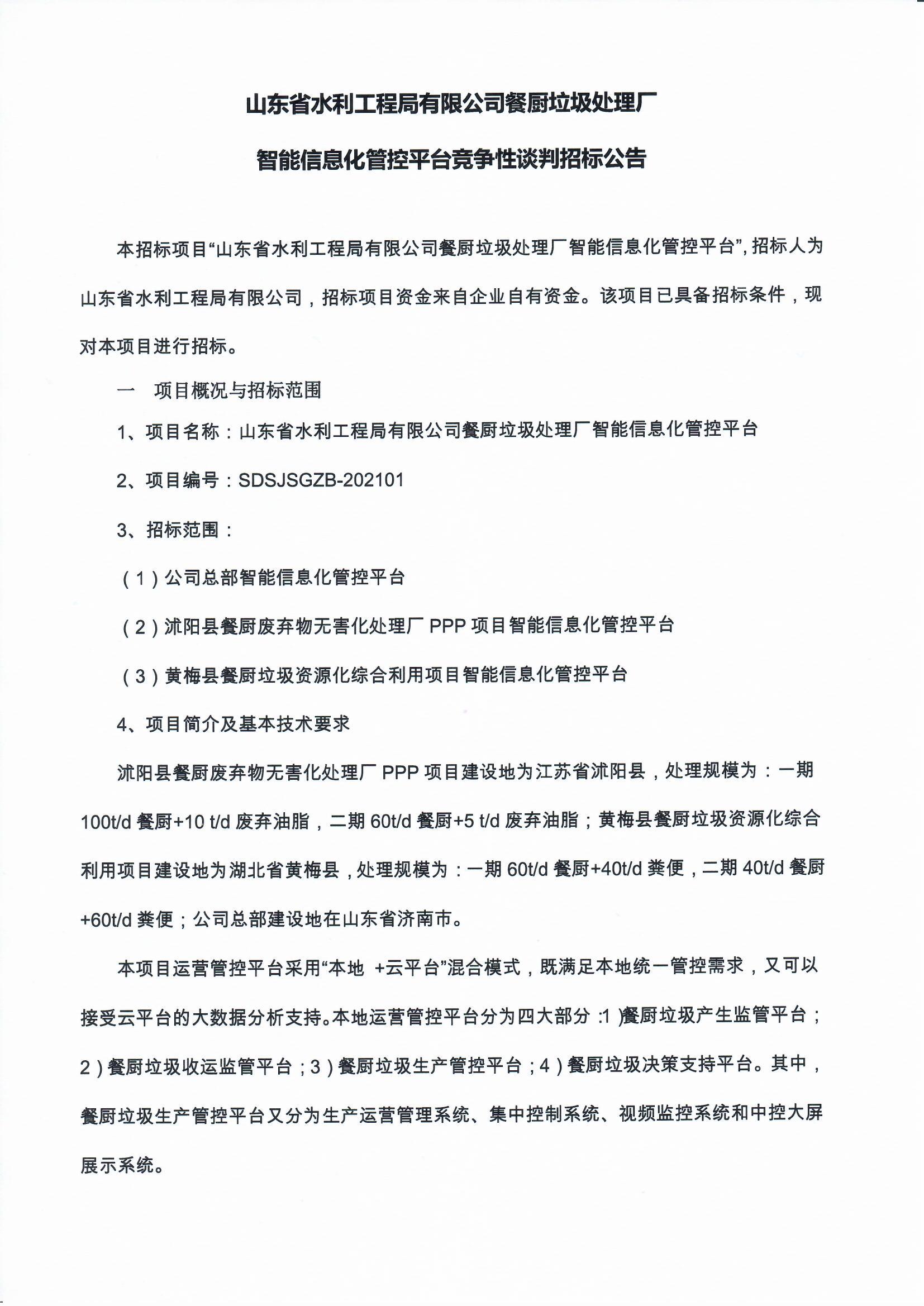 山東省水利工程局有限公司餐廚垃圾處理廠智能信息化管控平臺競爭性談判招標公告