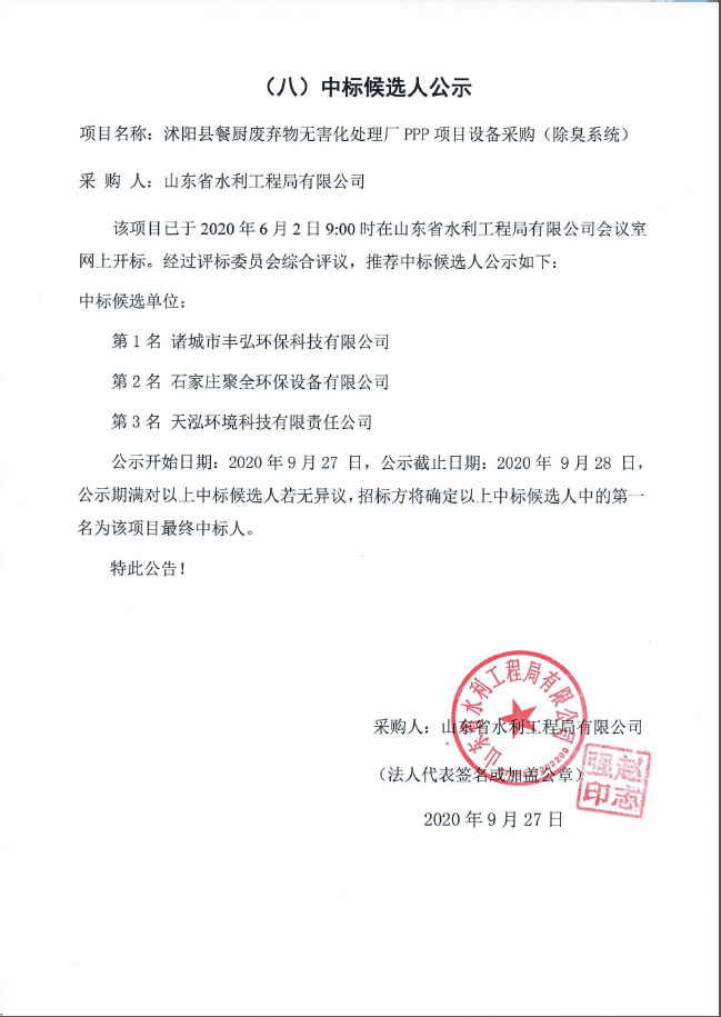 沭陽縣餐廚廢棄物無害化處理廠PPP項目設(shè)備采購(除臭系統(tǒng))中標(biāo)候選人公示