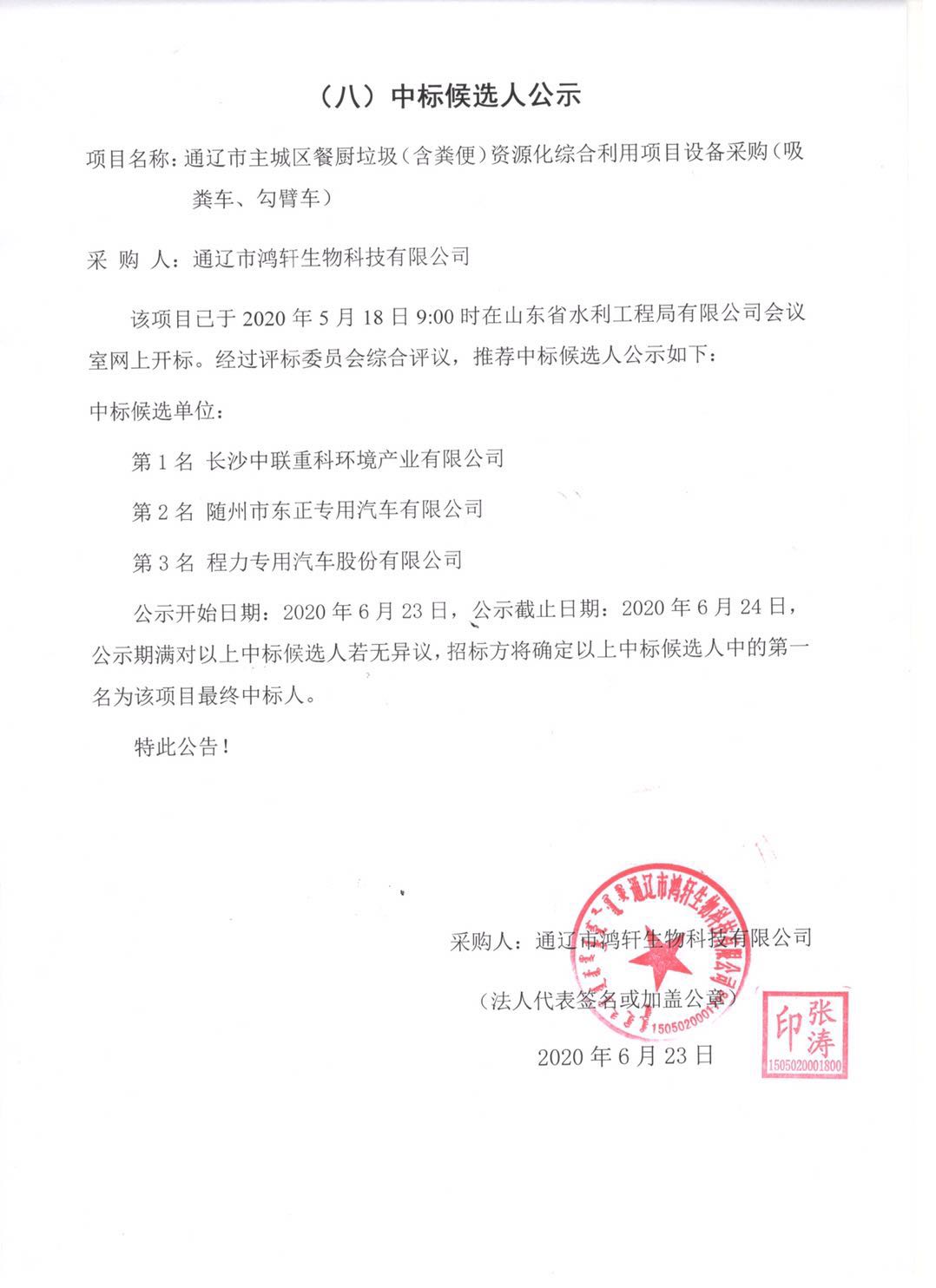 通遼主城區(qū)餐廚垃圾(含糞便)資源化綜合利用項目設備采購中標候選人公示