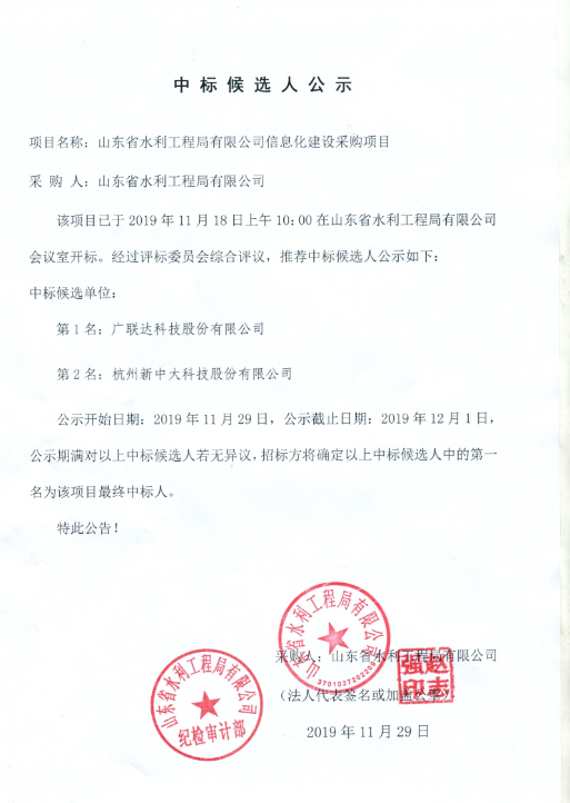 山東省水利工程局有限公司信息化系統(tǒng)采購項(xiàng)目中標(biāo)候選人公示