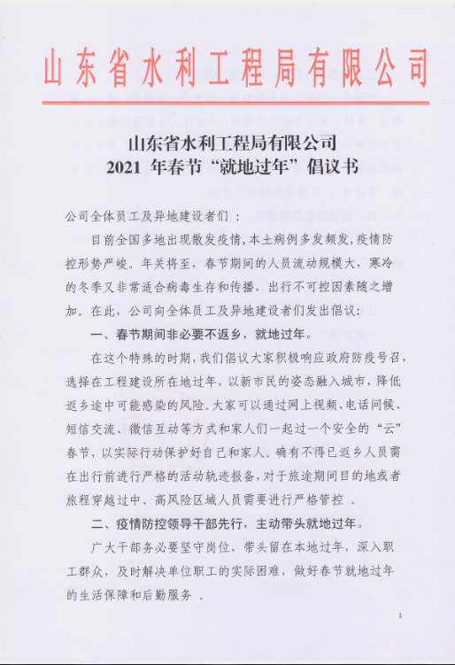 山東省水利工程局有限公司2021年春節(jié)“就地過(guò)年”倡議書