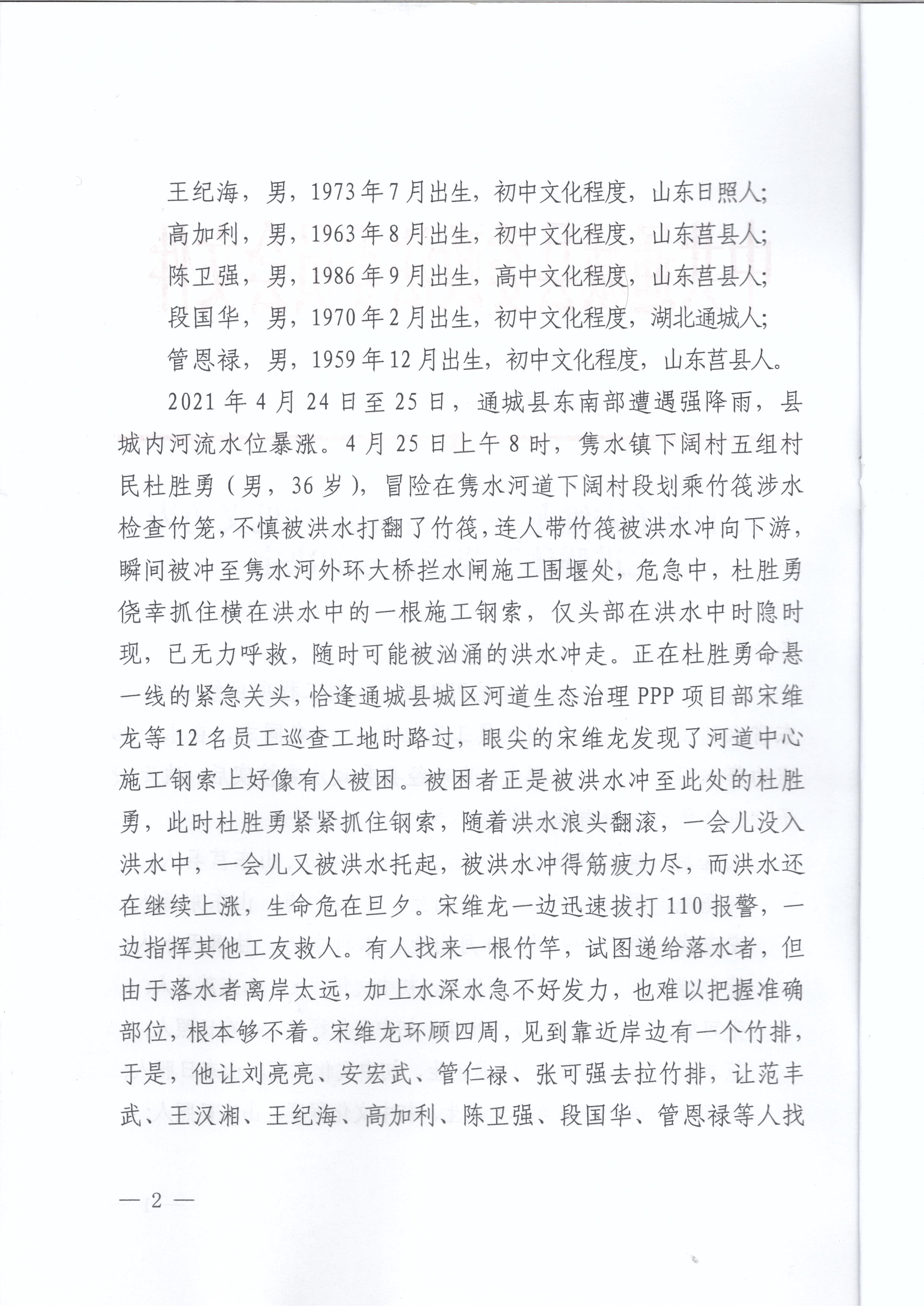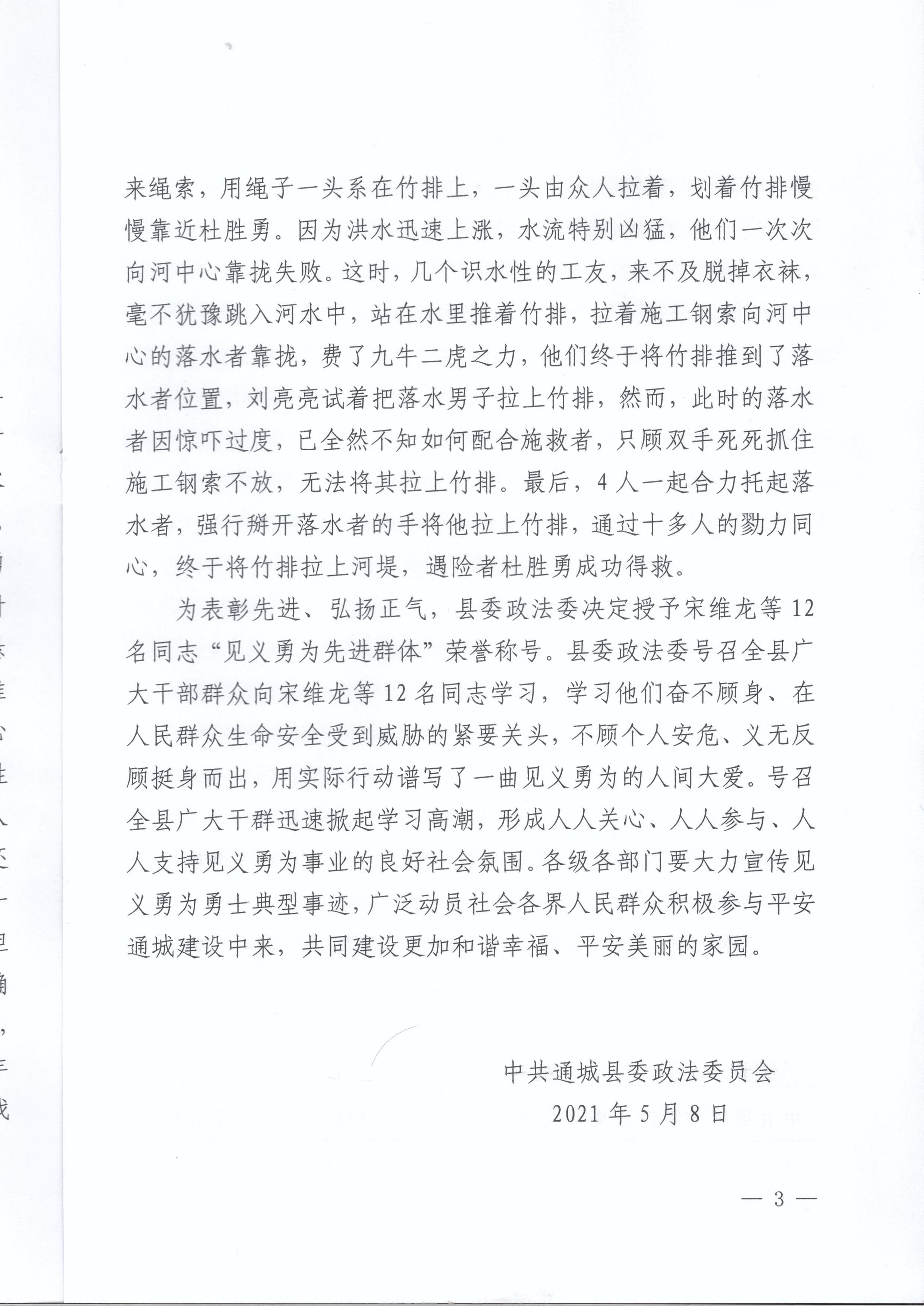 5月8日,為弘揚公司通城縣城區(qū)河道生態(tài)治理PPP項目部宋維龍等12名同志的見義勇為行為,中共通城縣委政法委員會決定授予宋維龍等12名同志“見義勇為先進集體”榮譽稱號,號召全縣廣大干部群眾向他們學習。